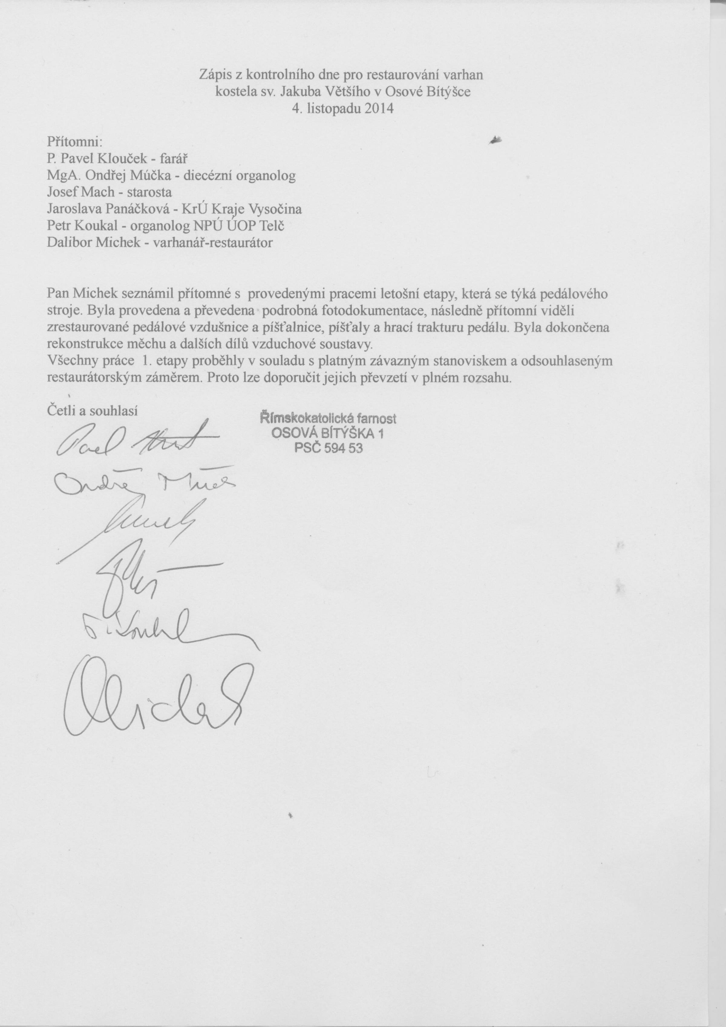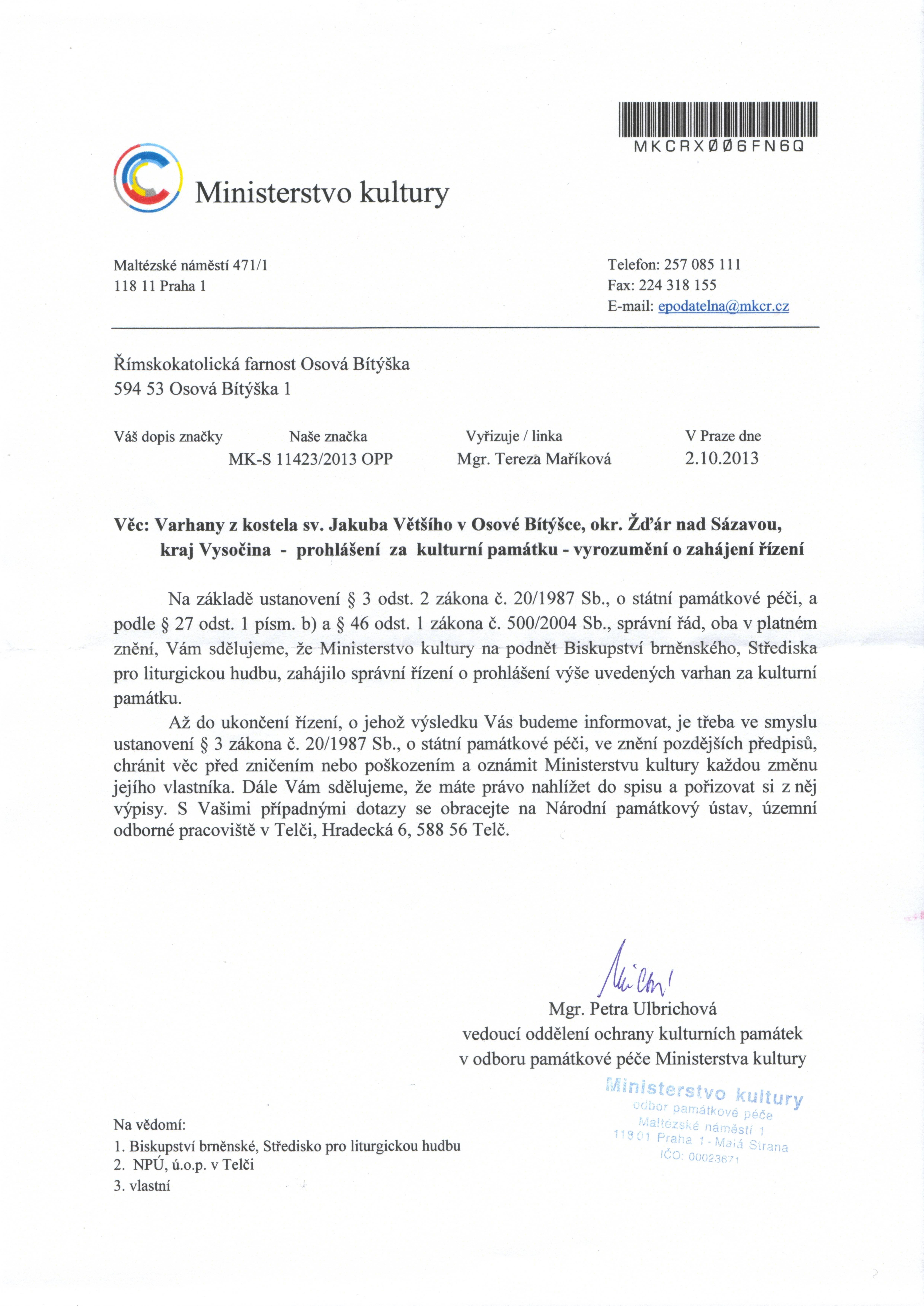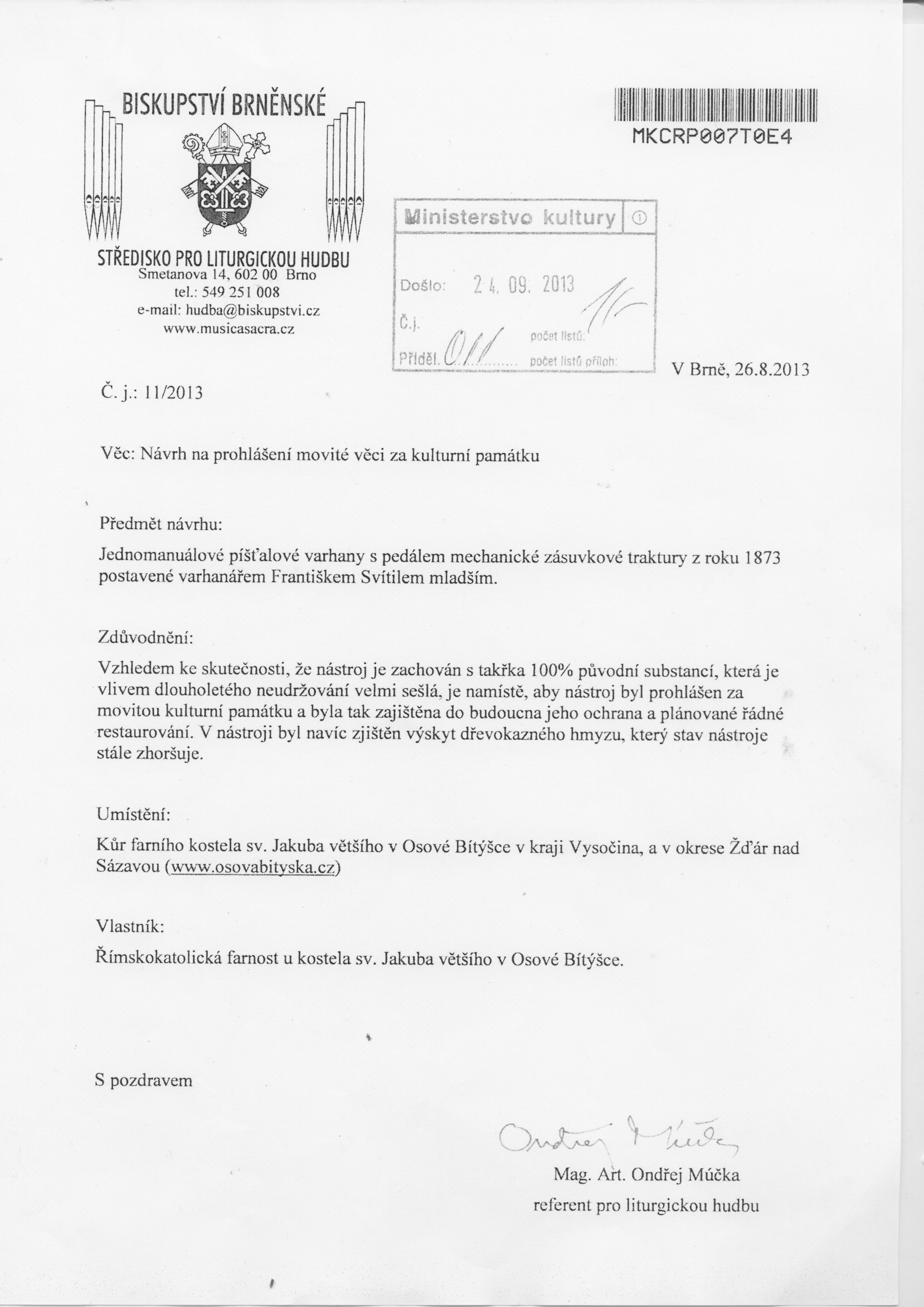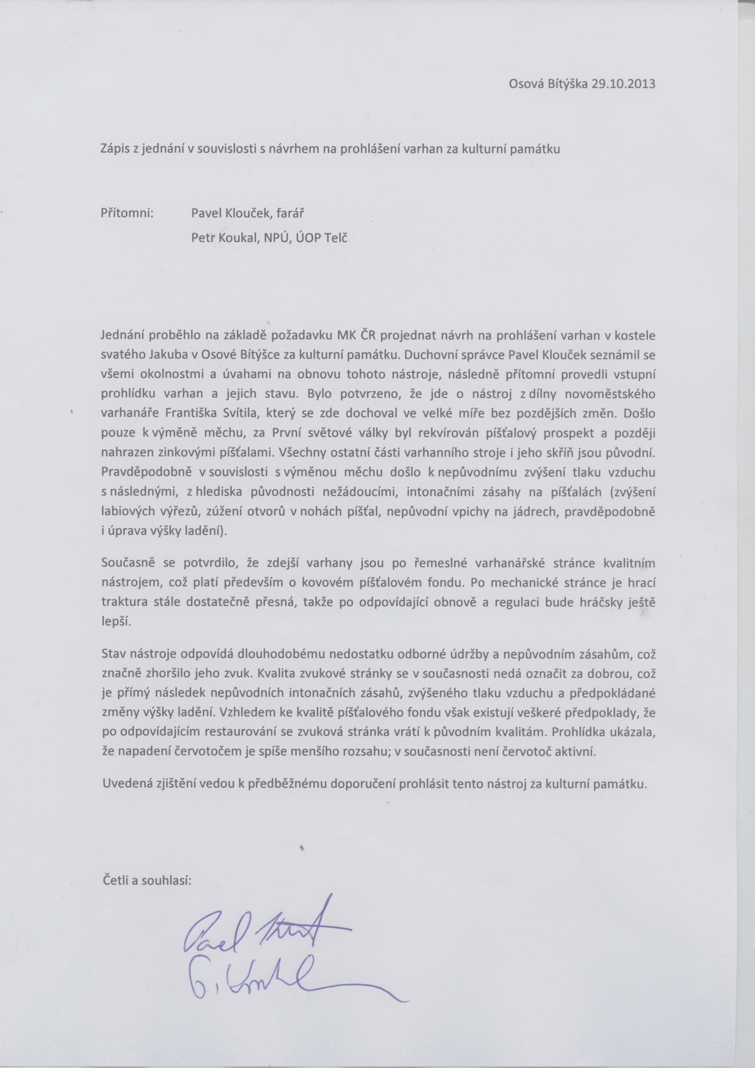 Zde je sken dokumentu, ze kterého se farnost Osová Bítýška dozvídá, že byl zahájen proces prohlášení varhan v kostele svatého Jakuba za kulturní památku.